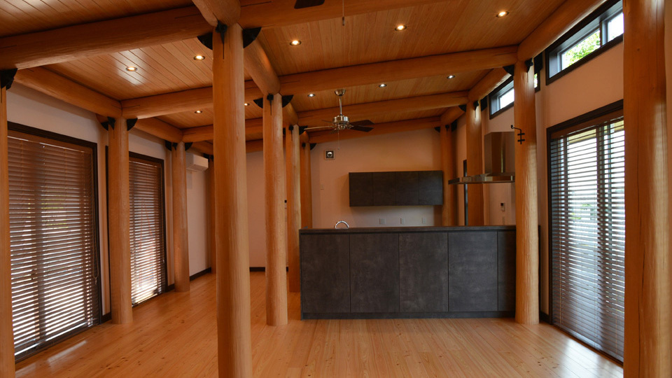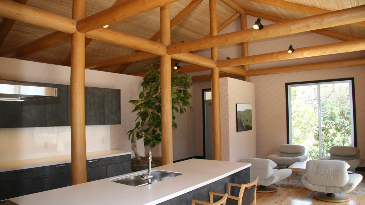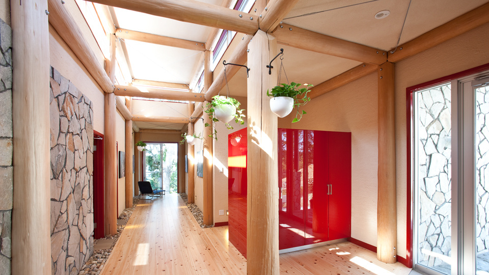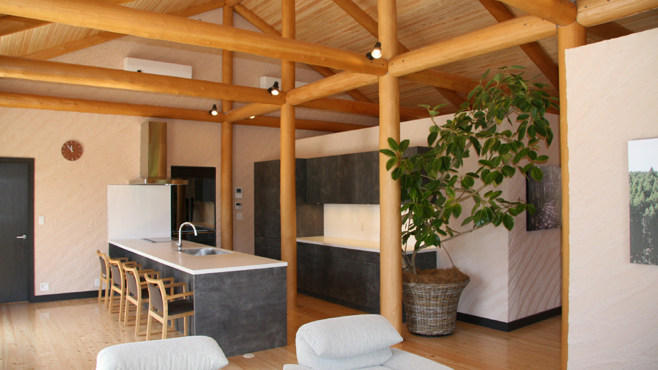 今作では、本工法の施工性確認、耐力上必要な壁の減量などに挑戦しました。 エントランスおよび廊下部分が広く高く設けられており、来訪者が訪れてすぐに磨き丸太の伸びやかな垂直性を感じることが出来るようデザインしています。