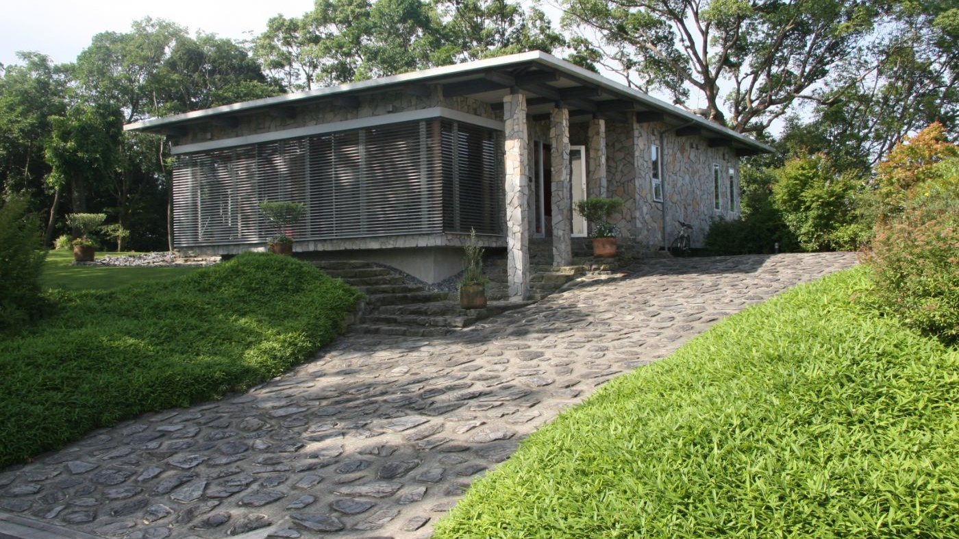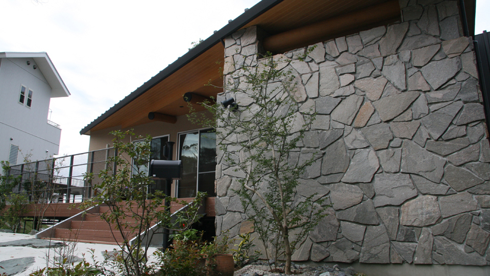 エントランス外部に十文字に構えた磨き丸太が象徴的な建物です。